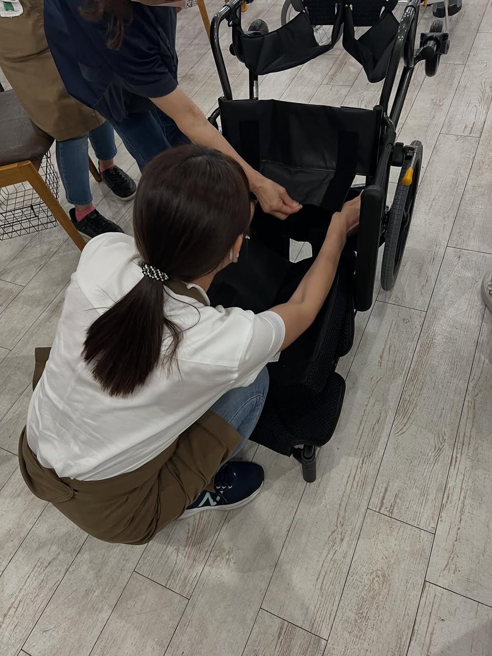 背の高い人、低い人、それぞれに対してフットサポート高さ、座奥行き、背もたれ高さなどをしっかりチェックしながらの練習。