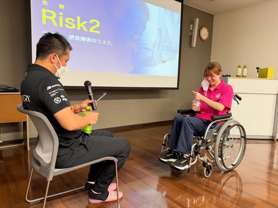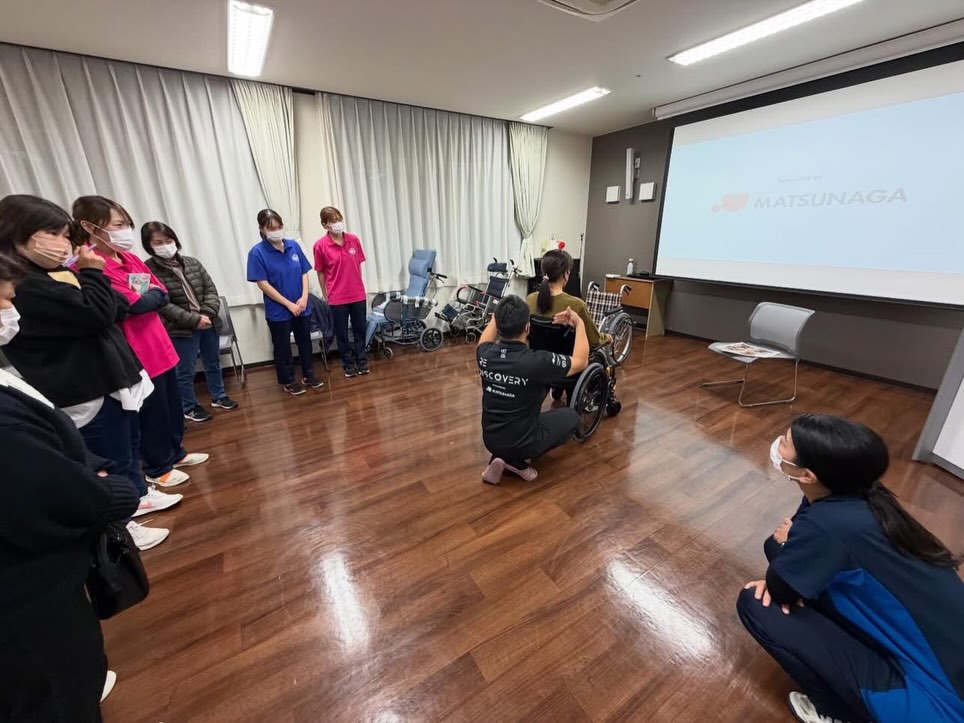 今回は、新入職の若手スタッフの方々に実際に車椅子のデモをお手伝いいただきましたが、基本的なことから応用的なことまで、とても積極的にご参加くださいました。